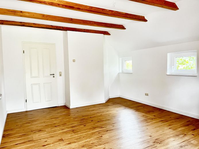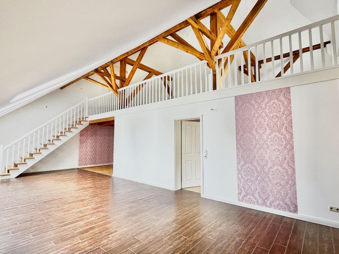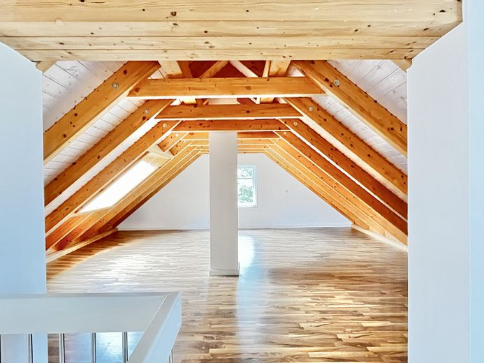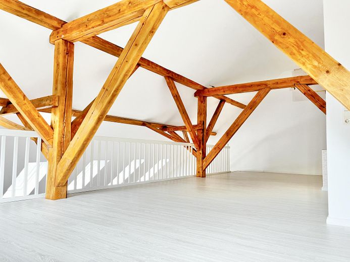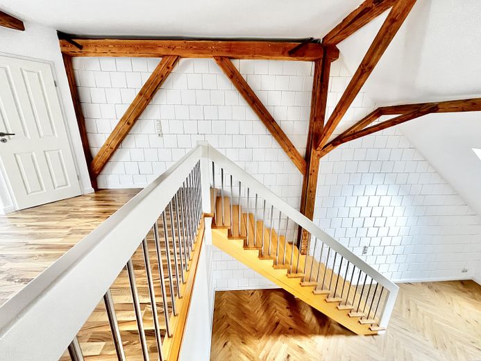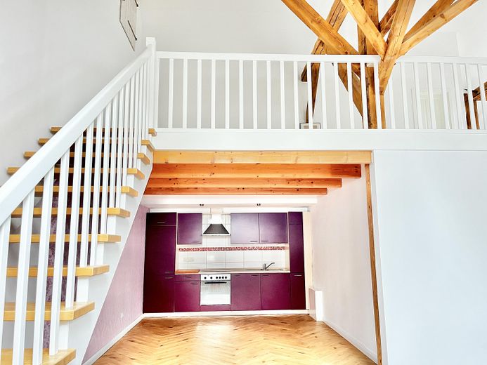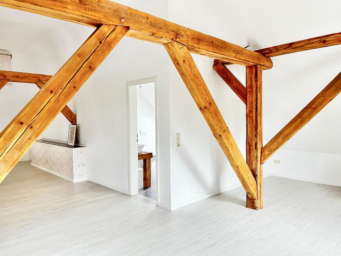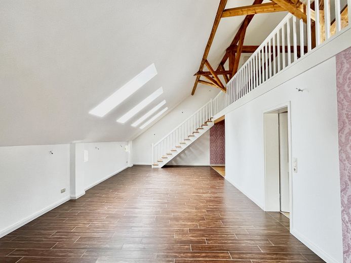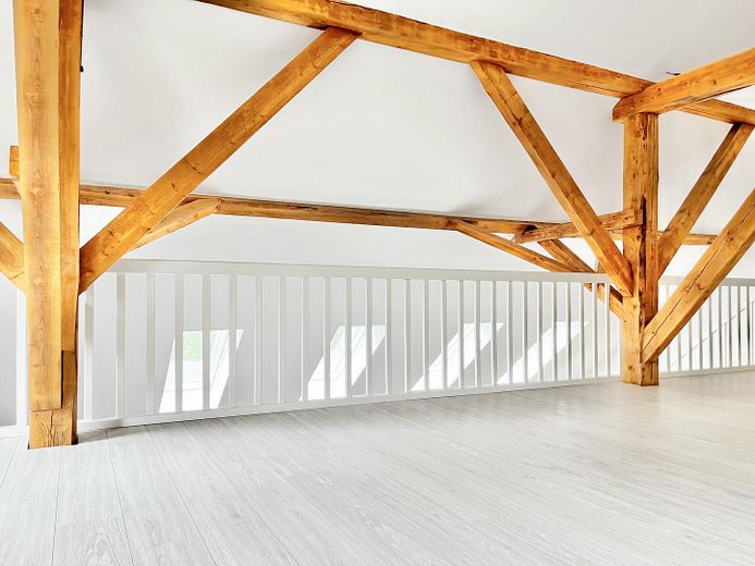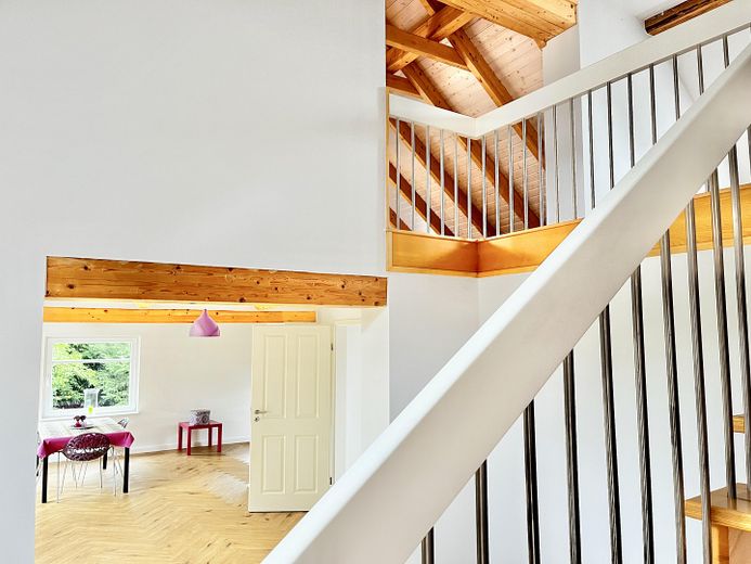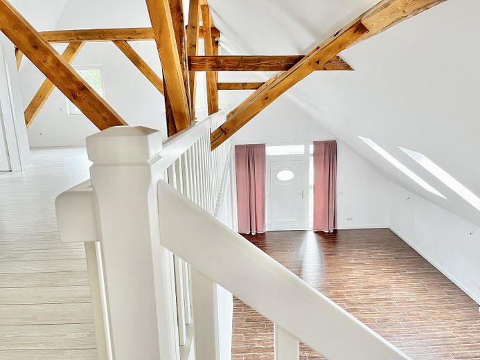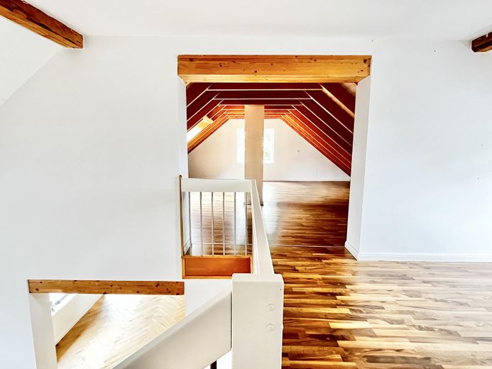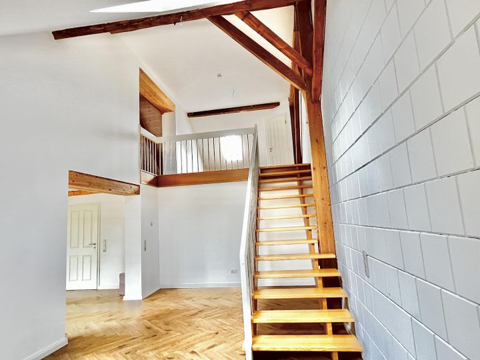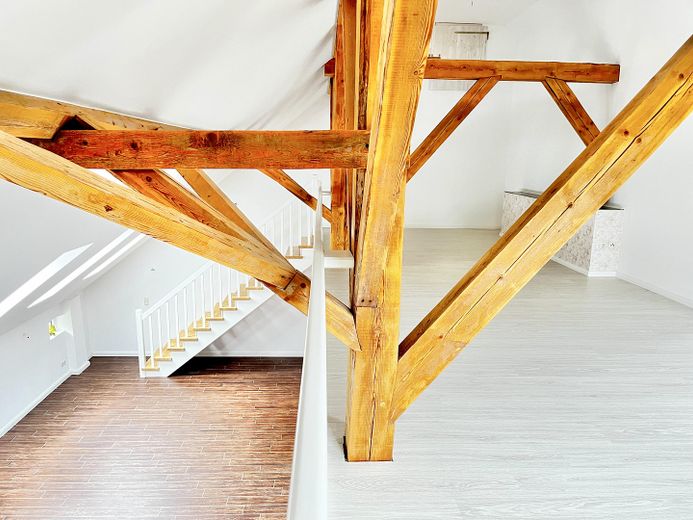 Die andere Wohneinheit beeindruckt durch einen großräumigen offenen Loftcharakter auf zwei Ebenen mit imposanter Deckenhöhe, die dem Wohnraum ein Gefühl von Weite und Großzügigkeit geben. Highlight ist die offene Balkenlage mit aufgearbeiteten Originalbalken und 4 zusätzliche Velux-Fenstern, die für einen außergewöhnlichen Lichteinfall sorgen.