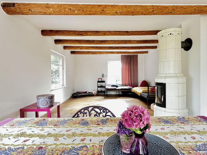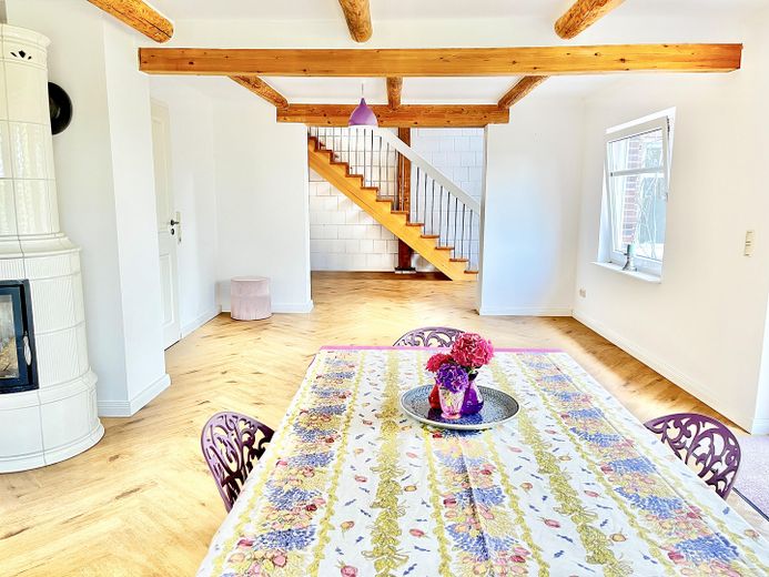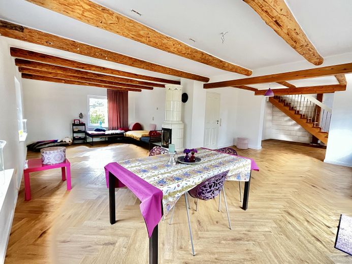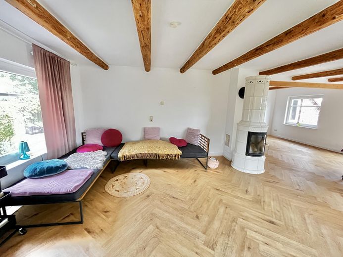 Gerade die Kombination aus ursprünglichen Holzbalken und Holzständerwerken, edlen Fußböden, lichtdurchfluteten Wohnräumen, einer Designkalksandsteinwand und einem anmutenden Kachelofen der Firma „Hark“ verleihen der gesamten Immobilie eine besondere Atmosphäre zum Wohlfühlen.