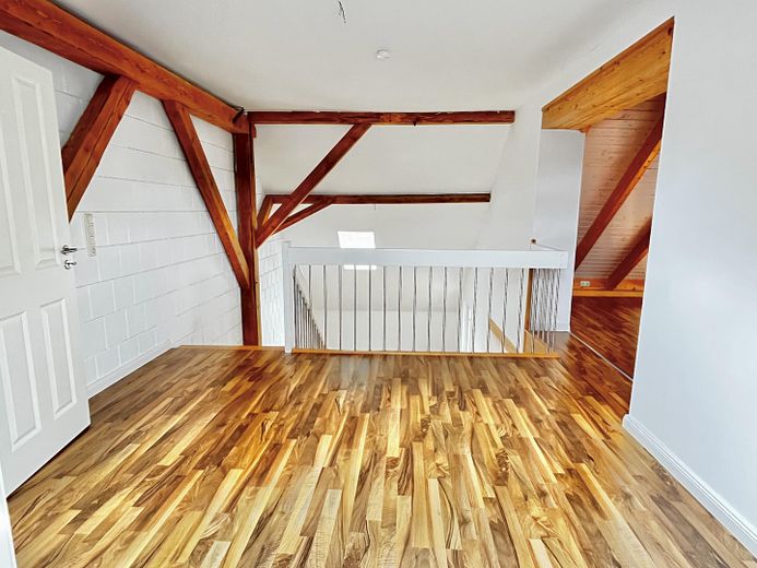 ▪ OG - stilvolle Galerie mit fachmännisch aufgearbeitetem und offen gelegtem Holzständerwerk sowie Schlafzimmer, Duschbad