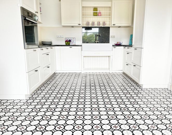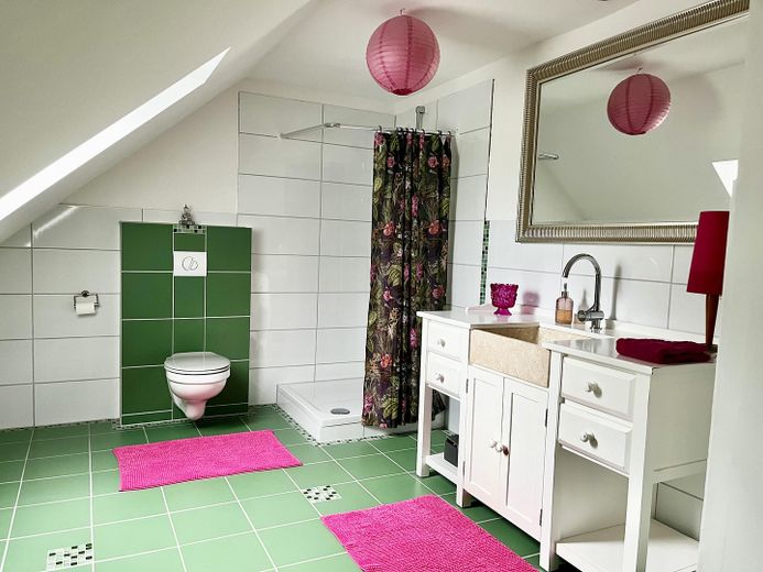 2021 wurden die Böden erneuert - hochwertiges Vinyl-Parkett (u.a. Fischgrät) und qualitätvolle Zementfliesen der Firma „Miracolour“ fügen sich passend dem Stil des Hauses ein. Abgerundet wird dies durch Berliner Fußleisten.