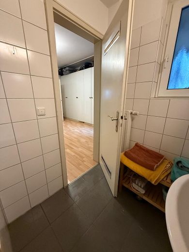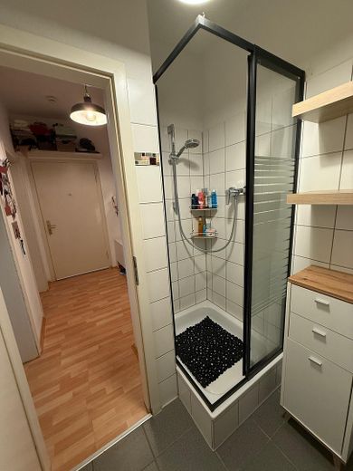 Im Wohnbereich ist Laminat verlegt und das Badezimmer ist gefliest.