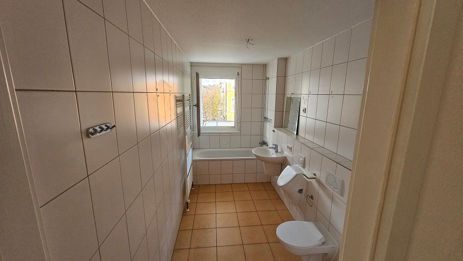 - Tageslichtbad: Badewanne, Waschbecken, Urinal und WC