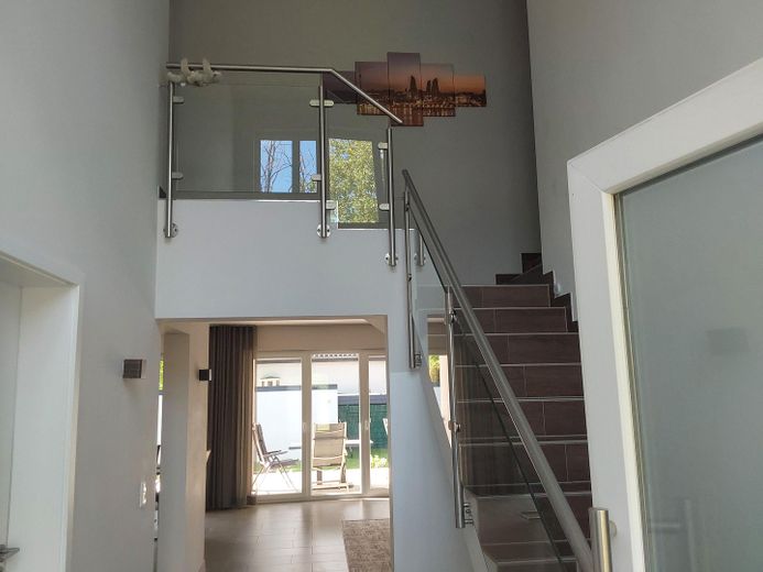 Großzügiges modernes, lichtduchflutetes Einfamilienhaus, auch zur Teilgewerblichen Nutzung geeignet. Das Haus verfügt über 5 Zimmer, eine große Terrasse ca. 40 qm, eine Garage und sechs weitere PKW-Stellplätze sind vorhanden. Separates Balkon in OG, erreichbar über Schlaf und Kinderzimmer.