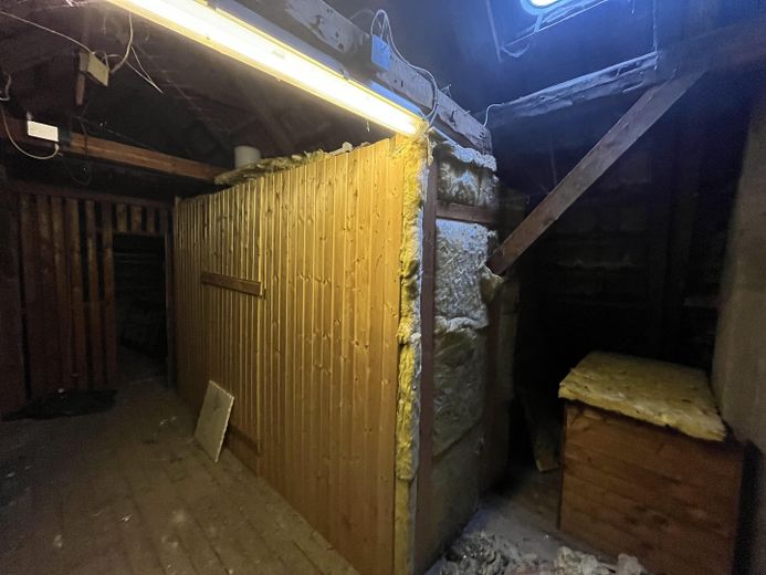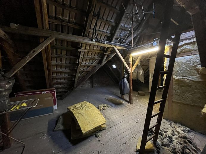 Alles wird verbunden durch einen großen Flur. Von einem kleinen Vorraum, in dem der Speicher und der Wechselrichter der Photovoltaik-Anlage (10 kW, 13,3 kW Peak Leistung) stehen, kommt man per Treppe in den nicht ausgebauten Dachboden, der noch einmal ca. 100 m² Fläche bietet. Hier steht in einer Holzverschalung die Solvis-Heizung für oben.