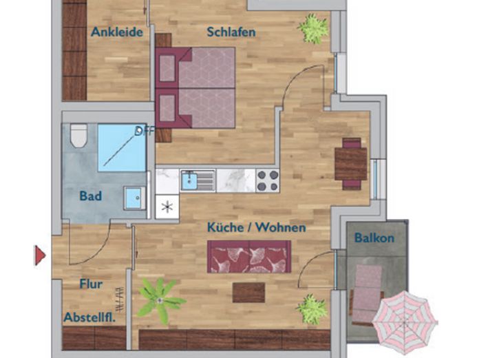 Zur Vermietung gelangt eine optimal geschnittene 2-Zimmerwohnung im Dachgeschoss. Im hellen großzügigen Wohnbereich ist die offene Küche mit moderner EBK integriert. Für Entspannung und Wohlbefinden sorgt der gemütliche Balkon. Hier können Sie gemütliche Stunden mit Freunden oder der Familie verbringen. Das Schlafzimmer verfügt über eine Ankleide und einen optimalen Zuschnitt. Das moderne Bad mit einer ebenerdiger Dusche und einem Handtuchheizkörper ist exklusiv ausgestattet. Der Anschluss für Ihre Waschmaschine sowie ein zusätzlicher Abstellraum zur Wohnung befinden sich im Treppenhaus.
