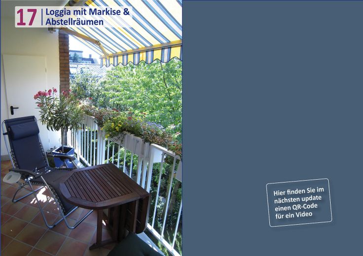 Ein großer Pluspunkt dieser Wohnung ist die großflächige Loggia in Westlage mit Blick auf die bepflanzte Grünanlage über der Tiefgarage. Schatten und Kühle finden Sie unter der vorhandenen Markise.