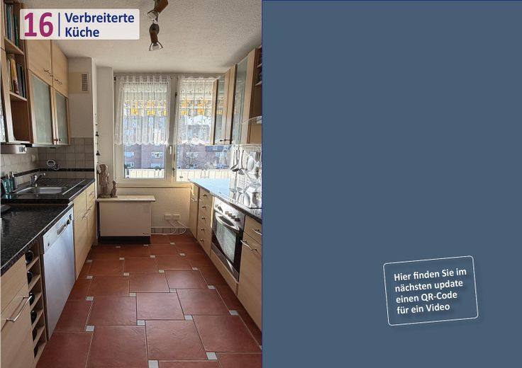 • 2004 wurde die Küchenwand versetzt, um beidseitig Arbeitsplatten einsetzen zu können. Die Küche hat im Gegensatz zu den anderen Wohnungen ein weiteres Fenster. Unter dem Fenster wurde aufgemauert, wodurch eine Fensterbank geschaffen und mit Marmor belegt wurde.