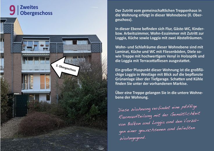 Wohn- und Schlafräume dieser Wohnebene sind mit Laminat, Küche und WC mit Fliesenböden, Diele sowie Treppe mit hochwertigem Venyl in Holzoptik und die Loggia mit Terracottafliesen ausgestattet.