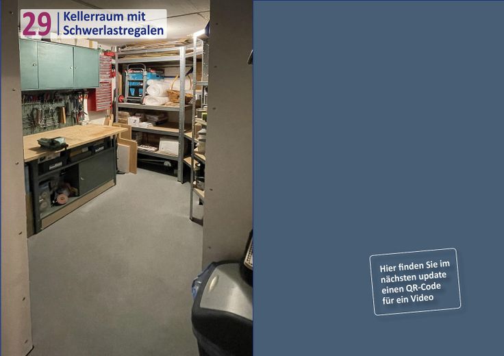 • Der zur Wohnung gehörende ca. 2 x 3 m große Kellerraum wurde 2023 rundum mit durchdacht angeordneten Schwerlastregalen ausgestattet.