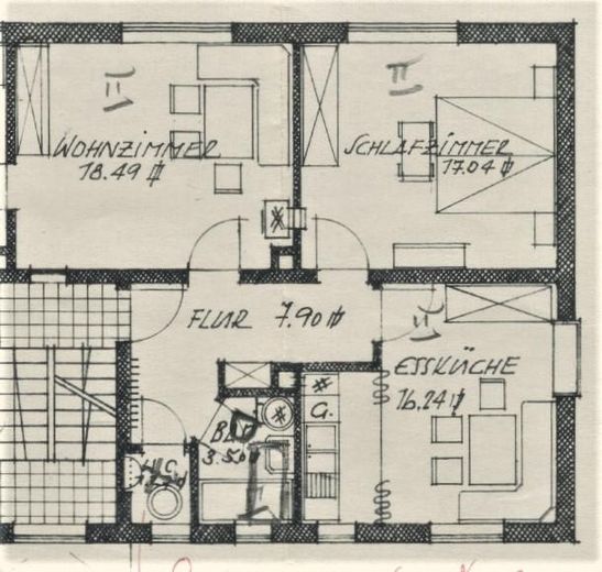 Zimmer: Wohnküche, Wohnzimmer/Schlafzimmer, Schlafzimmer, Bad, Flur, Abstellraum
