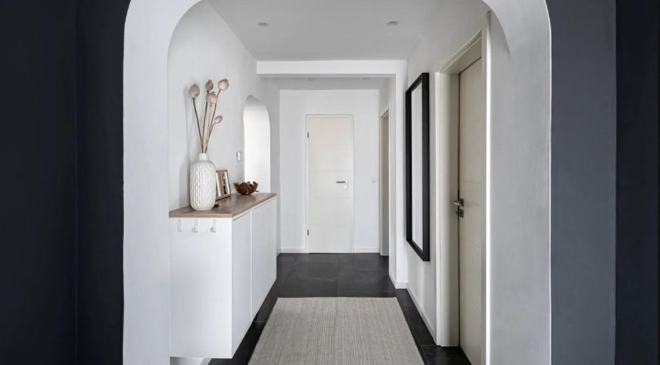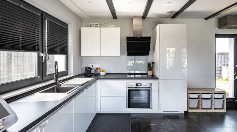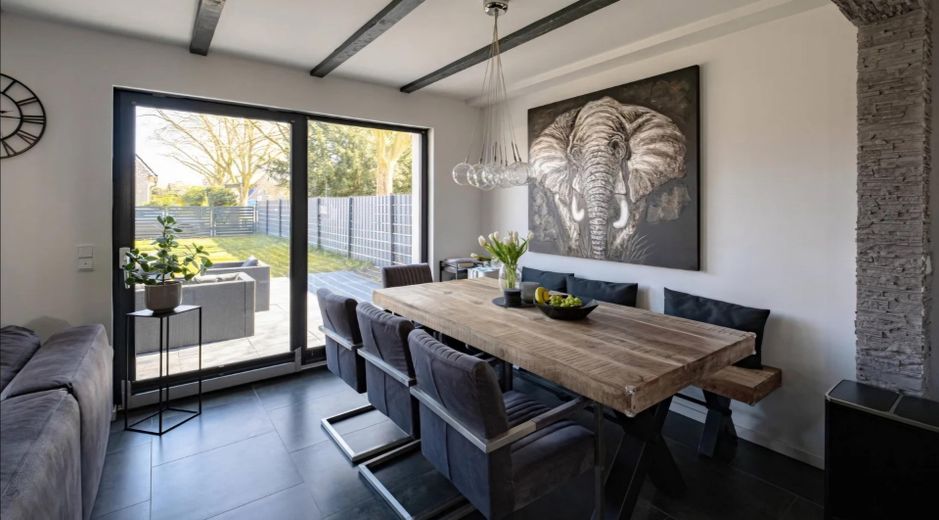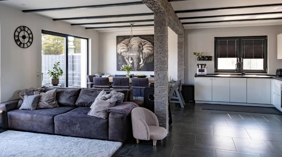 Der Zugang erfolgt über den Eingangsbereich mit Flur, von dem aus sowohl ein Hauswirtschaftsraum, ein Gäste-WC als auch ein flexibel nutzbares Zimmer – ideal als Büro oder Gästezimmer – erreichbar sind. Von hier aus öffnet sich der großzügig gestaltete Wohnbereich, der dank der breiten Fensterflächen zur Terrasse mit viel Tageslicht versorgt wird. Der Essplatz und die moderne, offen konzipierte Küche sind harmonisch in den Wohnraum integriert und bilden mit hochwertigen Materialien und zeitgemäßer Ausstattung eine stimmige Einheit.