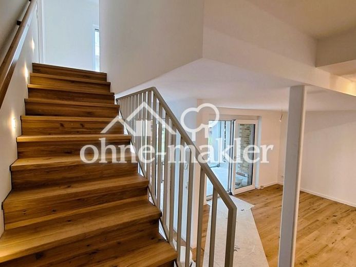 Das rechte Haus (WE 25) erstreckt sich über zwei Etagen: Im Gartengeschoss befindet sich der offene Wohn- und Essbereich mit vorinstallierten Küchenanschlüssen. Daran schließt sich der hochwertige Wintergarten an, ausgestattet mit Fußbodenheizung und allen Medienanschlüssen. Über den Wintergarten gelangt man über 2 Möglichkeiten zu Terrasse und Garten. Der Garten wird mit Rasen und Hecke bepflanzt. Ein Obstbaum und eine Magnolie stehen bereits.