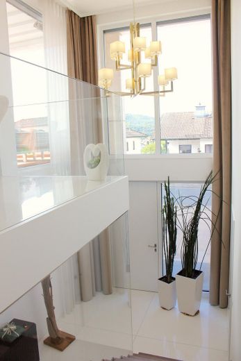 Betritt man die Immobilie, wird man von einem hellen Flur mit Blick in die 6 Meter hohe Galerie empfangen. Die hochwertige Ausstattung fällt bereits hier ins Auge und zieht sich - wie beispielsweise das aus Italien importierte Parkett der Treppen - durch das ganze Haus. Das in der Treppe integrierte Schuhregal (Maßanfertigung) lässt den Bereich zudem äußerst aufgeräumt wirken.