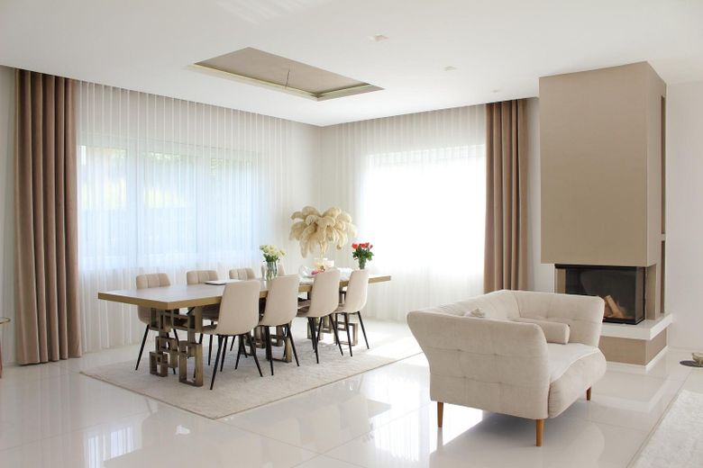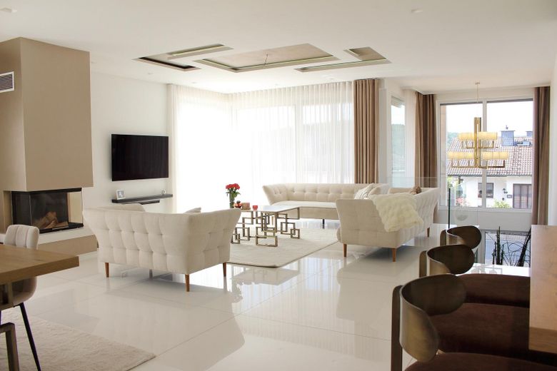 Hier spielt sich das Leben ab. Ein offener Wohn-Essbereich mit fast 83m² und nahtlos integrierter 70.000€-Designer-Küche sowie Kamin lädt zum Verweilen mit Familie und Freunden ein.