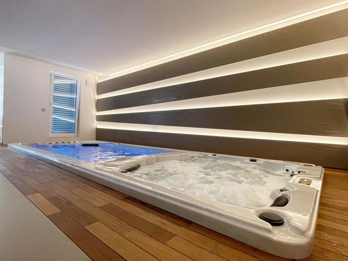 Das absolute Alleinstellungsmerkmal dieser Immobilie ist der individuell ausgebaute Wellness-Bereich großzügiger Spa-und Multifunktionsfläche - was flächentechnisch einer eigenständigen Wohnung entspricht. Integrierte Glaselemente lassen den gesamten Bereich hell, freundlich und ansprechend wirken.