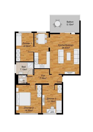 Der großzügige Wohn-/Essbereich mit integrierter Küche (neue Einbauküche wird im November geliefert) bildet das Herzstück der Wohnung. Von hier aus gelangen Sie auf den sonnigen Balkon. Drei weitere Zimmer bieten sich als Schlafzimmer, Kinderzimmer oder Homeoffice an.
