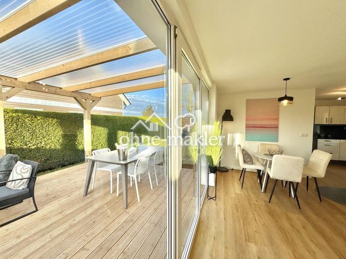 Die rund 81 m² Wohnfläche sind optimal aufgeteilt: Ein heller Wohn- und Essbereich mit großflächigen Fenstern öffnet sich direkt zur überdachten Terrasse. Die offene Küche schafft fließende Übergänge und eine moderne Wohnatmosphäre. Für gemütliche Abende sorgt ein Kamin, der Wärme und Atmosphäre verbindet.