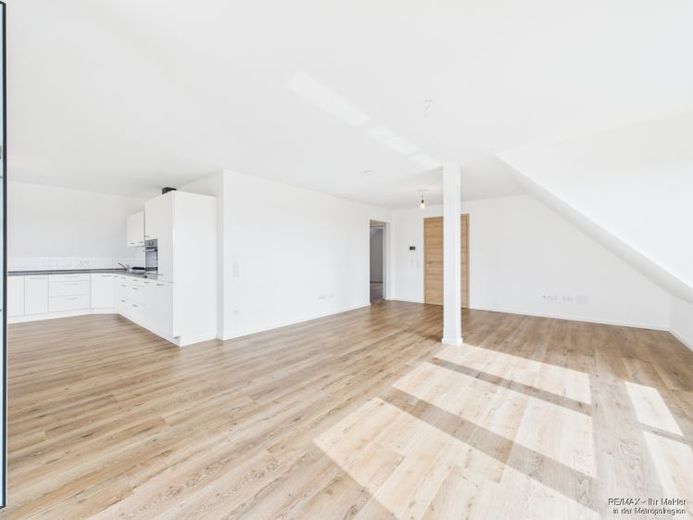 Diese moderne Dachgeschosswohnung bietet auf ca. 97 m² Wohnfläche ein komfortables Zuhause. Der Eingangsbereich führt direkt in den großzügigen Wohn- und Essbereich, der durch seine offene Gestaltung und die großen Fensterfronten viel Licht und Raum bietet. Der hochwertige Bodenbelag in Holzoptik verleiht dem Raum eine warme Atmosphäre.