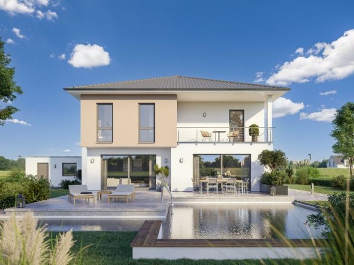 Die Stadtvilla Pallas ist ein wahr gewordener Wohntraum der Moderne. Auf zwei Geschossen finden Sie insgesamt 5 lichtdurchflutete Räume, die dem hohen Anspruch an maximalen Wohnkomfort gerecht werden. Eines der Highlights im Erdgeschoss ist der offene Wohn- und Essbereich, der mit einem Tunnelkamin optisch voneinander getrennt werden kann. Die Küche bietet Platz für eine schöne Kochinsel, die vor allem die Herzen von Hobby-Köchen höher schlagen lässt. Der Eingang zur Speisekammer wird modern als Teil der Küchenfront integriert. Das Erdgeschoss wird komplettiert durch ein Home-Office, ein Duschbad sowie den Hauswirtschaftsraum.