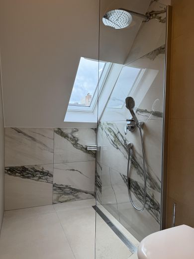 Das hochwertig geflieste Badezimmer besticht durch modernes Design und eine bodentiefe Dusche mit Regendusche – hier trifft Funktionalität auf stilvolle Ausstattung.