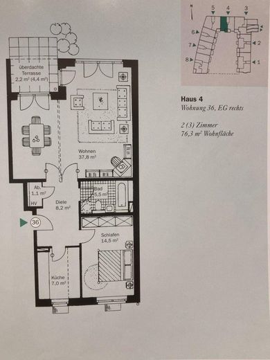 Zu der Wohnung gehört noch ein Abstellraum im Keller, sowie ein Garagenstellplatz für einen großen PKW und zwei Motorräder. Drei Fahrradräume gehören ebenfalls zu der Anlage.