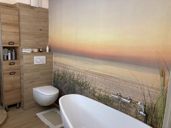 - Komplett ausgestattetes Bad mit doppelter Waschgarnitur, Badezimmerschrank, Dusche und Badewanne
