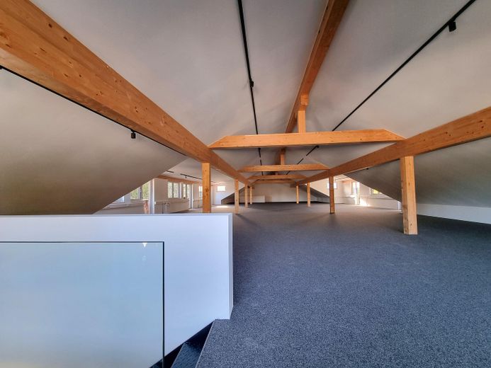Errichtet in traditioneller Holzbauweise, bietet das Gebäude eine einzigartige Verbindung aus regionaler Baukultur und zeitgemäßem, offenem Raumdesign. Lichtdurchflutete Büros schaffen ein inspirierendes Arbeitsumfeld für Unternehmen, die Zukunft und Verantwortung verbinden möchten.