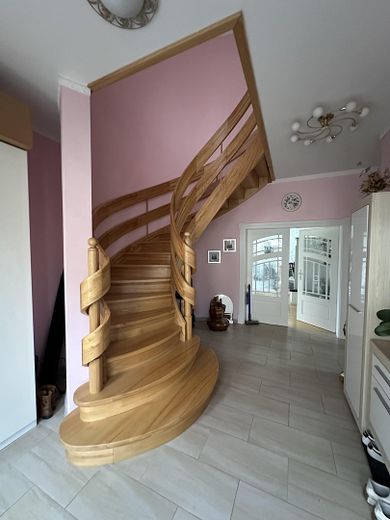 Wendeltreppe: Eine elegante Wendeltreppe dient als zentrales, skulpturales Designelement, das die verschiedenen Ebenen stilvoll miteinander verbindet.