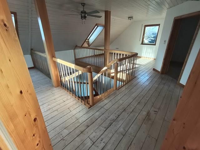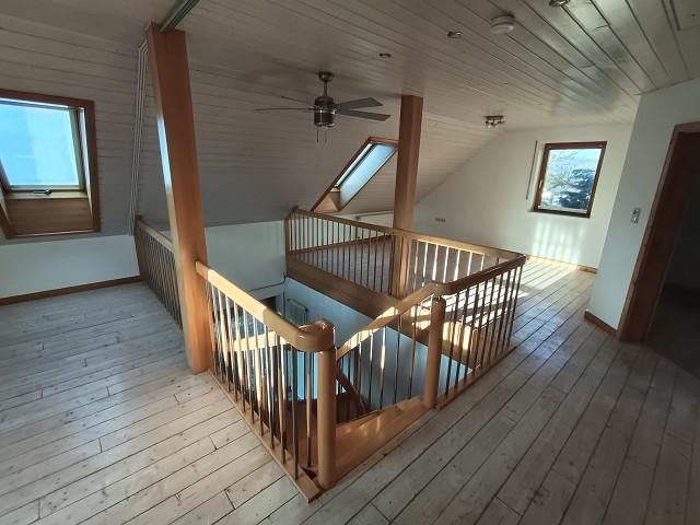 Grosses Wohnzimmer, angrenzende Küche mit Vorratsraum, 2 Galeriezimmer, offene Bauweise, Licht durchflutet. 3 Schlafzimmer, Tageslichtbad mit Wanne, Dusche und Blockbohlen-Sauna (neuer Ofen mit Steuerung), Zweite Bad im OG. Tageslicht Toilette und Handwaschbecken. Alle Fenster mit Aussenrollos.