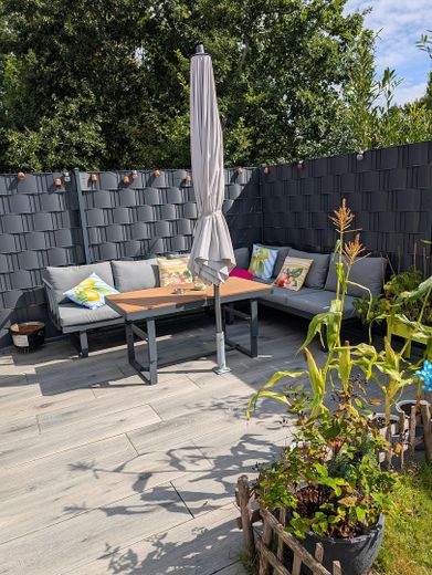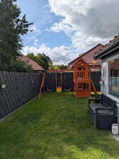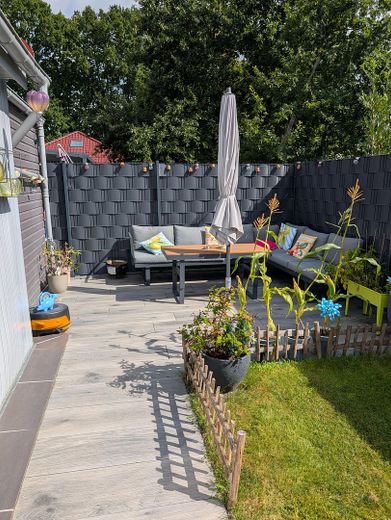 Eingezäuntes Grundstück: Der pflegeleichte Garten auf dem 348 m² großen und komplett eingezäunten Grundstück bietet Privatsphäre und Sicherheit für Kinder und Haustiere.