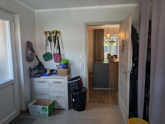 Erdgeschoss: Heller und einladender Eingangsbereich, Gäste-WC mit Dusche, großzügiger Hauswirtschaftsraum, offene Wohnküche mit Zugang zur Terrasse und zum Garten.