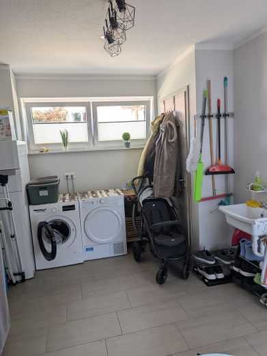 Großer Hauswirtschaftsraum: Praktischer Stauraum und Platz für Waschmaschine und Trockner.