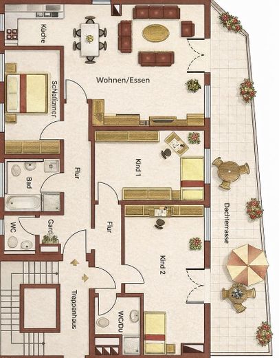Diese attraktive und großzügig geschnittene 4-Zimmer-Wohnung bietet auf ca. 133 m² Wohnfläche viel Platz für Familien oder Paare mit Homeoffice-Bedarf. Besonders hervorzuheben ist die große Dachterrasse, die zusätzlichen Wohnkomfort im Freien schafft.
