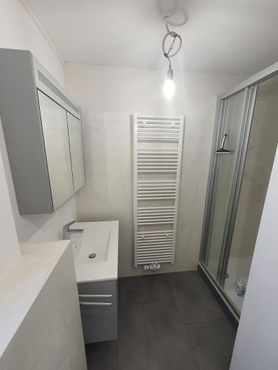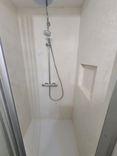 Das hochwertige Badezimmer besticht durch eine elegante Ausstattung mit einer großzügigen Dusche und stilvollen Armaturen.