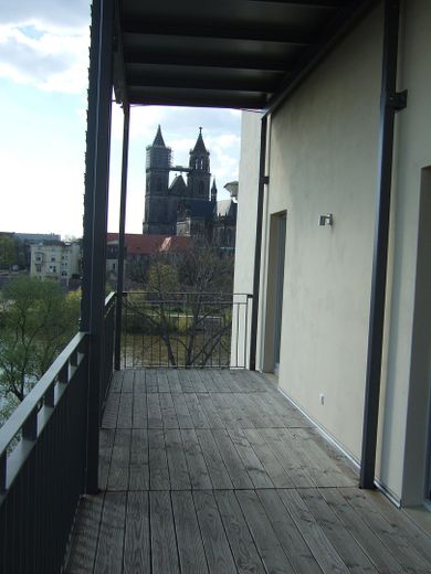 Lichtdurchflutete Wohnung, bodentiefe Fenster zur Südseite, Originaldielen aus der Bauzeit, moderne Einbauküche in weiß und Hochglanz, Boschgeräte, Bad mit Dusche, Solnhofener Marmor, großer Balkon zur Südseite mit Blick auf den Dom und die Elbe, Aufzug, Gartenanlage.