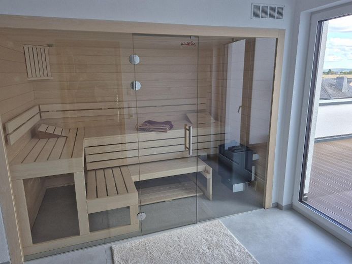 Im Erdgeschoss erwartet Sie ein ca. 60 m² großer, offener Wohn- und Essbereich mit separater Küche. Ein Gästezimmer/Büro, ein modernes Bad und ein Hauswirtschaftsraum mit Zugang zur Doppelgarage runden das Raumangebot ab. Im Obergeschoss finden Sie zwei Schlafzimmer, eine Galerie sowie einen Wellnessbereich mit Sauna, Dusche und WC. Von hier aus gelangen Sie direkt auf die 35 m² große Dachterrasse. Das 700 m² große Grundstück verfügt über eine teilweise überdachte Terrasse (12 x 3,5 m), einen Garten mit Rasenfläche und Werkzeugschuppen.