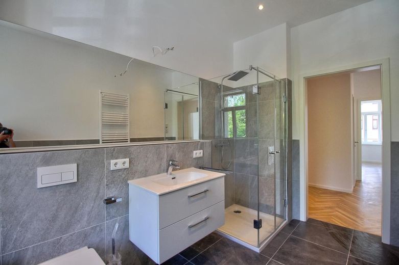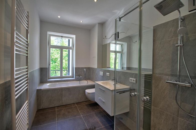 -Ein hochwertig ausgestattetes Badezimmer mit Designer- Fliesen von Villeroy & Boch, einer vollverglasten Dusche, einem großen Spiegel, einer Badewanne, Handtuchheizkörpern, einem Badezimmerunterschrank von Villeroy & Boch und weiteren exklusiven Badezimmer Accessoirs wie Handtuchheizkörper und Toilettenbürstenhalterung