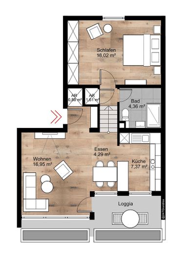Das Herzstück der Wohnung bildet der großzügige Wohn- und Essbereich mit offener Küche. Hier entsteht ein einladender Raum zum Kochen, Entspannen und Zusammensein. Ein separater Abstellraum sorgt für zusätzlichen Stauraum und Ordnung im Alltag.