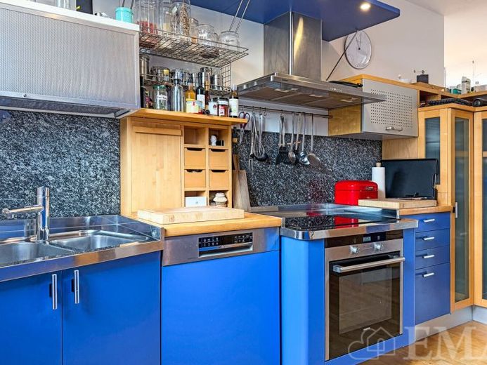 Im Obergeschoss befinden sich ein großes Galeriezimmer mit Blick ins Wohnzimmer, zwei weitere Zimmer, ein elegantes Badezimmer mit bodengleicher Dusche, Badewanne, Handtuchheizkörper und Bidet sowie ein Flur. In einem der Zimmer führt eine Treppe im Stil der Geschosstreppe in das Dachgeschoss. Die Wohnfläche im Obergeschoss beträgt ca. 80 m².