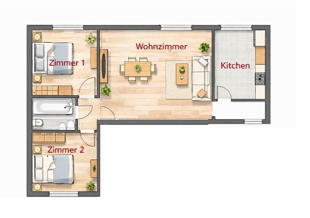 Der gut geschnittene Grundriss umfasst ein großzügiges Wohnzimmer mit direktem Zugang zur Balkon, zwei weitere Zimmer, die flexibel als Schlafzimmer, Kinderzimmer oder Homeoffice genutzt werden können, sowie ein modern gestaltetes Badezimmer mit zeitgemäßer Ausstattung. Durch die umfassende Kernsanierung besteht keinerlei Renovierungsbedarf.