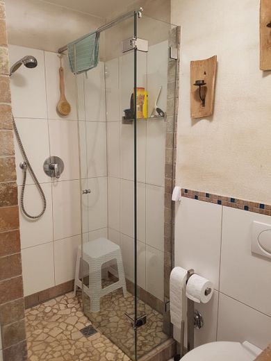 Das hochwertig ausgestattete Bad in Naturmarmor enthält eine große Dusche und einen ansprechenden Waschtisch. Ferner befindet sich dort das WC.