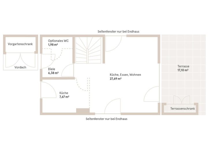 - Erdgeschoss: Windfang, Gästetoilette, großes Wohnzimmer mit offener Küche, Zugang zu Terrasse & Garten
