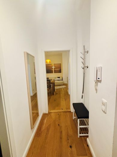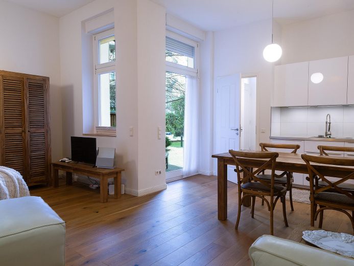 This charming one-room period apartment with approx. 50 sqm of living space is located on the ground floor of a carefully renovated building on Heinersdorfer Straße, just a few steps from Prenzlauer Berg. The apartment impresses with its classic period features, including high ceilings, oiled wooden floorboards, and a cozy sleeping alcove.