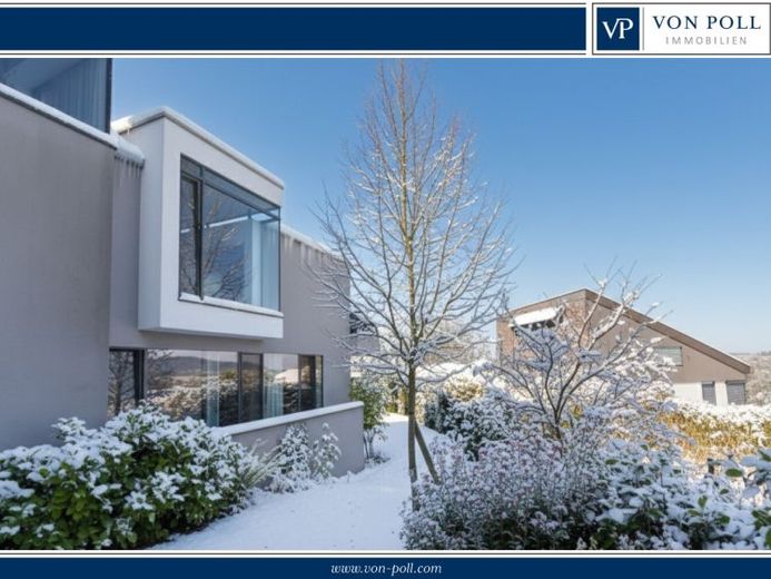 Schon beim Betreten des Hauses stellt sich sofort ein Gefühl der Leichtigkeit, Offenheit, aber auch von Privatheit ein. Dies wird erzeugt durch die Atrium Bauweise kombiniert mit weitläufigen Fensterflächen, die für eine natürliche Lichtdurchflutung sorgen und durch für hiesige Verhältnisse außerordentlich großzugig bemessene Raumhöhen (Essbereich bis zu 3580 mm, übriges Erdgeschoß 2640 mm).