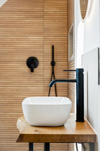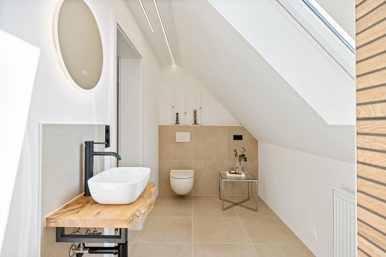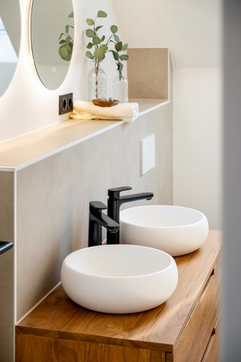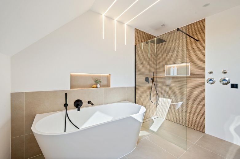 •2 moderne Badezimmer mit hochwertigen schwarzen Unterputz Armaturen von Hans Grohe und ebenerdiger Dusche sowie halbfreistehende Wanne. Die Fliesen sind von Villeroy und Boch. Des Weiteren wurde Wert auf indirekte Beleuchtung gelegt, sowie beleuchtete Badenischen.