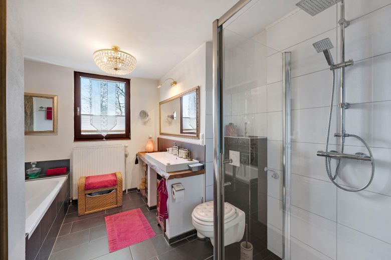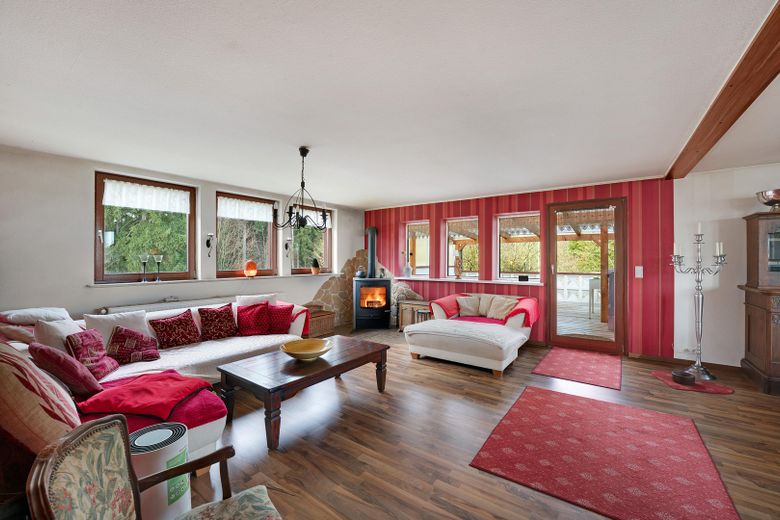 - DG ca. 115 m² mit vier Zimmern, Abstellraum, Terrasse und Kamin. Dach ca. 50 Jahre alt, Ölbrennwerttherme Baujahr 2015. Eine Garage und zwei Stellplätze sind vorhanden.