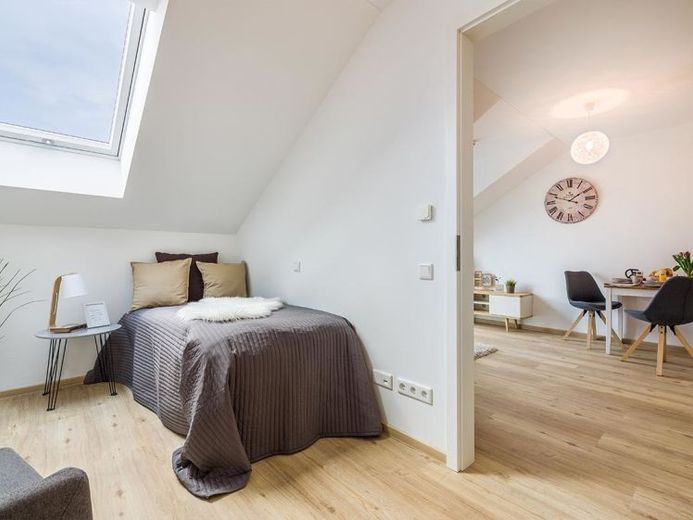 In diesem Neubau können Sie zur Eigennutzung oder als Kapitalanlage barrierefreie 2-Zimmer Dachgeschosswohnungen erwerben. Diese erreichen Sie bequem mit dem Aufzug, sie haben zwischen 32,33 m² und 49,30 m² und verfügen zum Großteil über einen sonnigen Südbalkon. Jede Wohnung ist mit einem hochwertigen und pflegeleichten Vinylboden ausgestattet, einem zeitlos schönen Duschbad und als Highlight einer Einbauküche mit Elektrogeräten. In der Eingangsdiele gibt es eigens eine riesige Nische für einen Garderobenschrank und auch in Ihrem Schlafzimmer können Sie einen großen Kleiderschrank unterbringen.