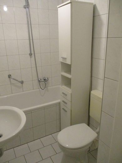 Gefliestes Bad mit Badewanne, Waschbecken, WC,