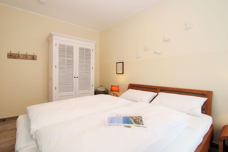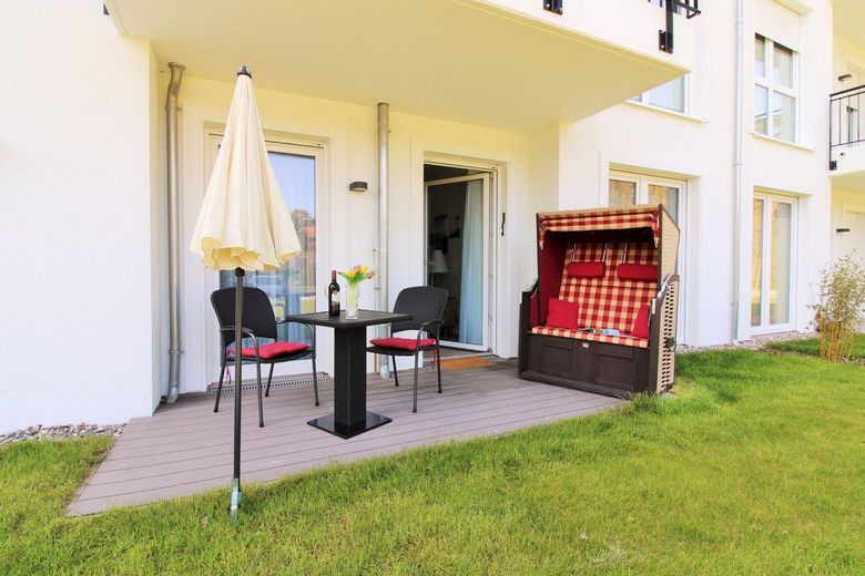 Das gemütliche Schlafzimmer verfügt über ein Doppelbett und das Wohnzimmer einen direkten Zugang zur Terrasse. Das Badezimmer ist mit einer bodenebenen Dusche, Waschbecken und Handtuch-Heizkörper ausgestattet.