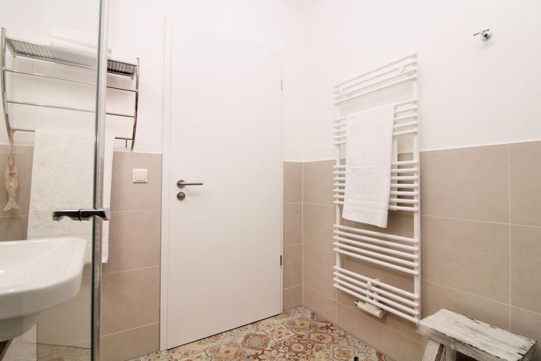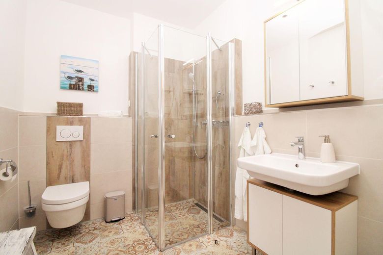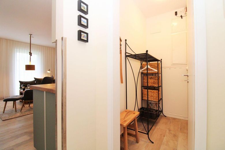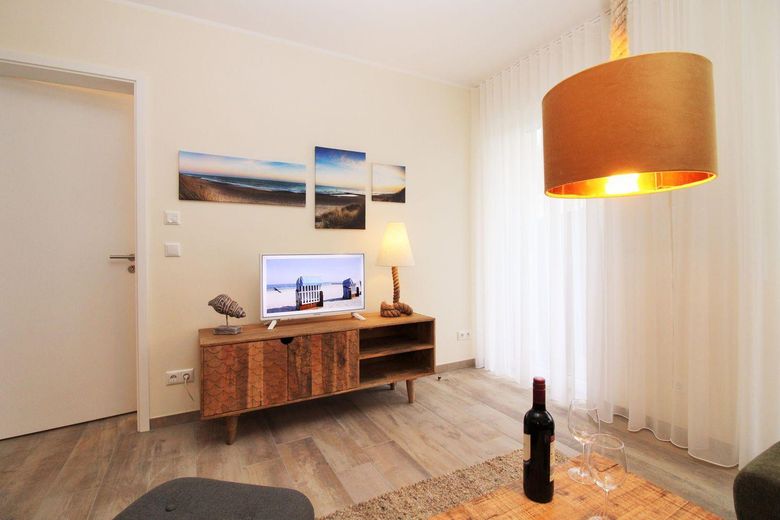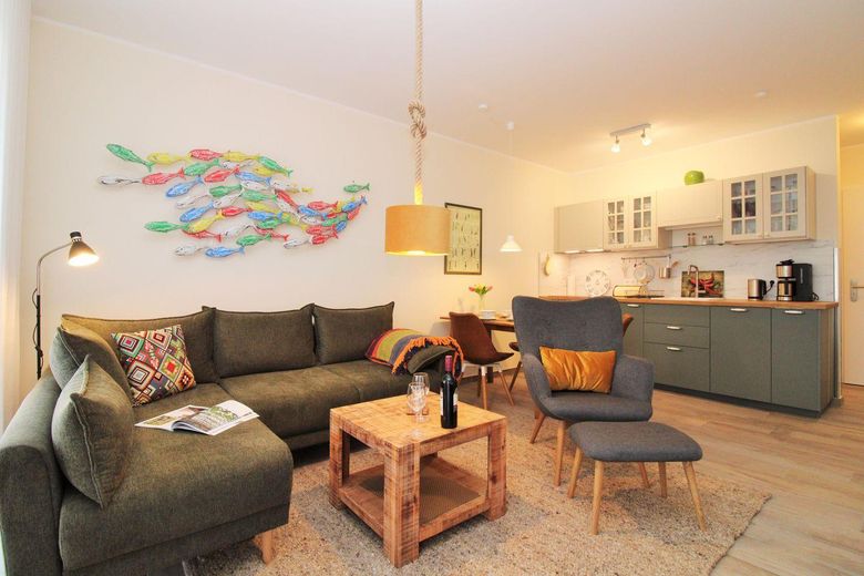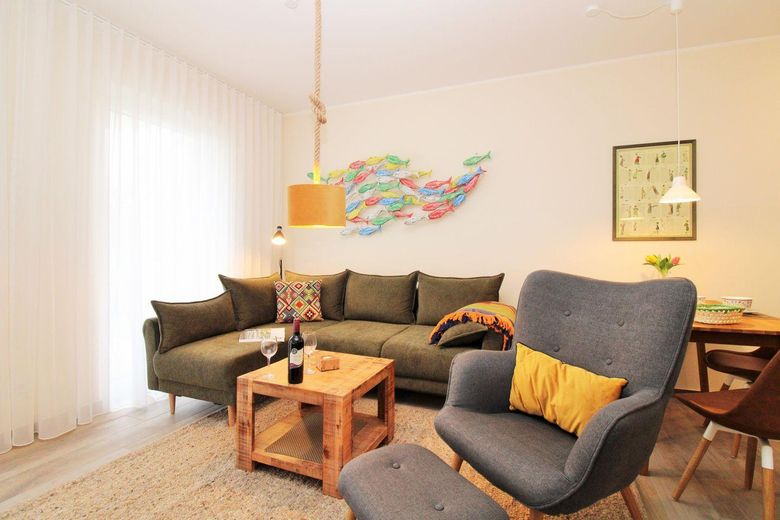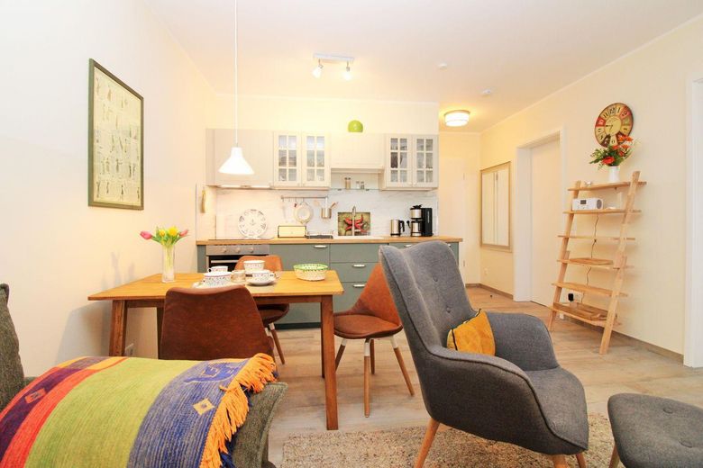 Die exklusive 2-Zimmer-Wohnung im Erdgeschoss besticht durch eine stilvolle und funktionale Einrichtung. Die gefliesten Böden mit Fußbodenheizung und die elektrischen Jalousien sorgen für ein angenehmes Wohnklima. Das moderne Wohn-/Esszimmer bietet eine bequeme Couch, zum Ausklappen (für 2 Personen) einen Esstisch und direkten Zugang zur sonnigen Terrasse mit Gartenanteil. Zur Unterhaltung stehen ein Smart-TV, ein Radio sowie eine Auswahl an Büchern und Spielen bereit.